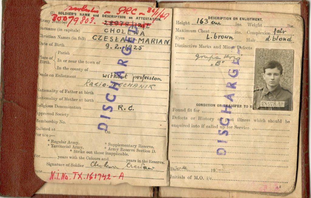 This image is taken from Chester’s Soldier Service and Pay Book, which he was obliged to always carry with him while technically serving with the British Army. In 1946, the British government formed the Polish Resettlement Corps as a holding unit for members of the Polish Armed Forces who had served with the British and did not want to return to communist Poland. Chester’s service book shows that he was discharged from the PRC on January 30, 1947, and that he was a trained radio mechanic.